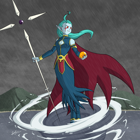 La mujer viste un vestido largo azul y granate, con una capa, y en su mano lleva una vara terminada en cruz. Su piel es celeste, su cabello es turquesa y sus ojos son rojos.
