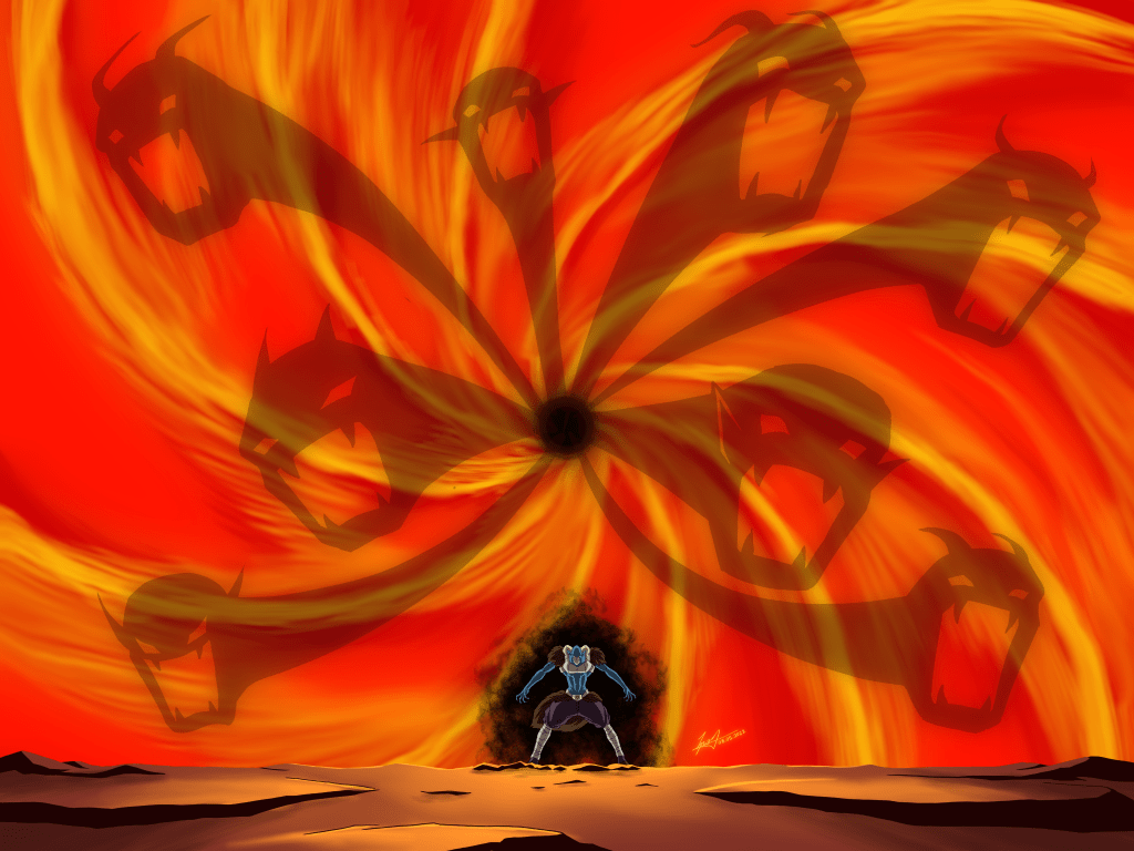 El aura flamígera de Moro es proyectada hacia el cielo, donde aparece un gran portal hacia el Makai.