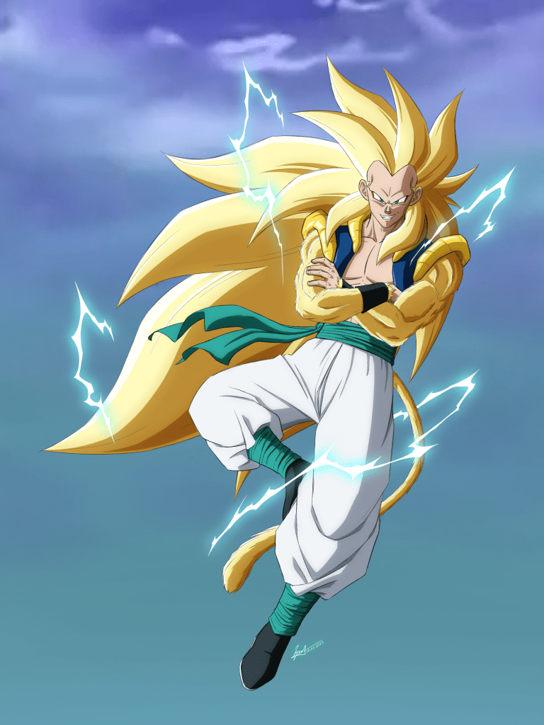– “Así que esto es el verdadero Súper Saiyajín 3…” – dice la fusión. – “Es un nombre muy largo… ¿y si lo llamamos Súper Saiyajín 4?”
