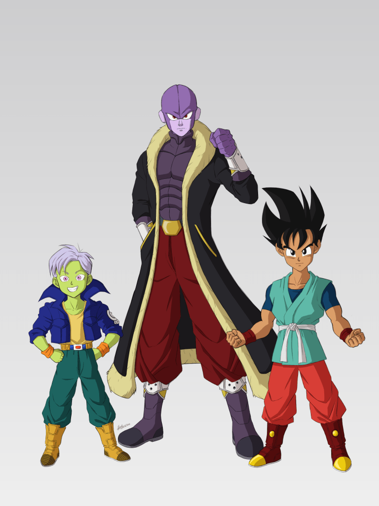 Punch y Gohan se ponen en pie. El primero lleva la ropa robada de Koros con la armadura de su padre. El hijo de Trunks y Cheelai lleva botas color ocre, pantalón verde, camiseta amarilla.