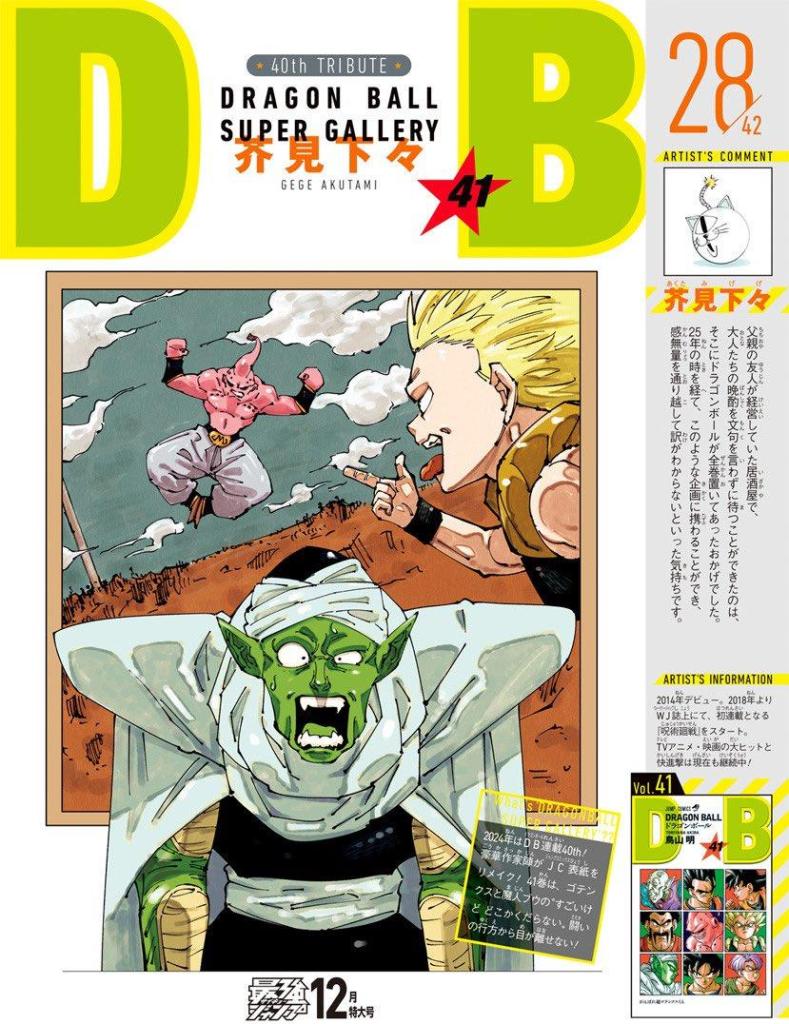 “¡Ni en mis sueños pensé que podría participar en un proyecto como este! Qué honor. Incluso yo, que no leía mucho manga en la escuela primaria, recuerdo haber copiado dibujos del Kamehameha en mi cuaderno. Después de convertirme en mangaka, asistí a exposiciones de obras de arte de Toriyama-sensei, e incluso ya de adulto, todavía me emocionaba mucho cada una de las páginas de sus ilustraciones. Siempre me ha conmovido. ¡Felicidades a Dragon Ball por su 40 aniversario!”