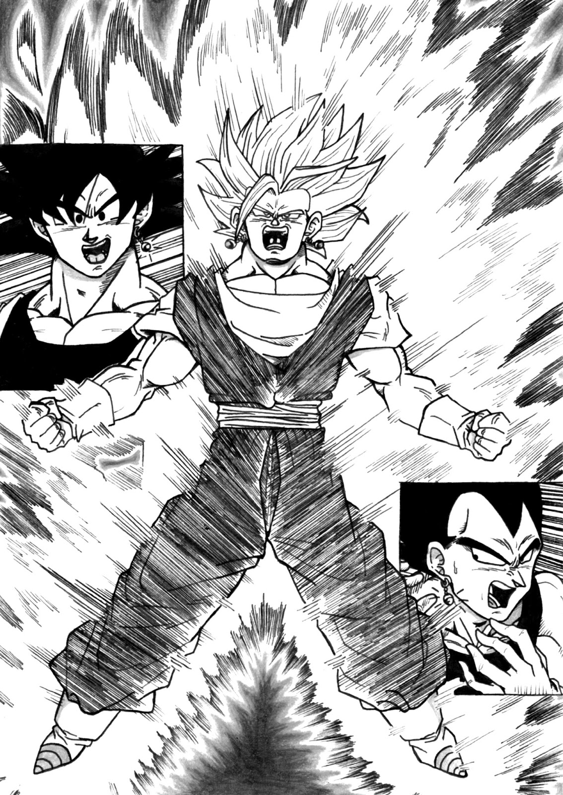 – “Eso es, Vegeta, busca esa chispa de ki divino en tu interior. Aún puedes exprimirla un poco más… Tienes que resistir hasta que llegue Son Goku.”