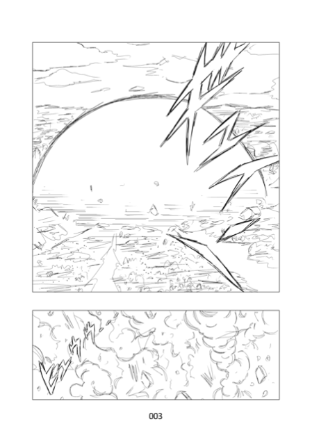 El tirano se eleva a toda velocidad y levanta su dedo índice hacia el cielo. Una pequeña esfera de ki morado, muy oscuro, y rodeada de rayos rojos, crece a gran velocidad hasta cubrir el cielo.