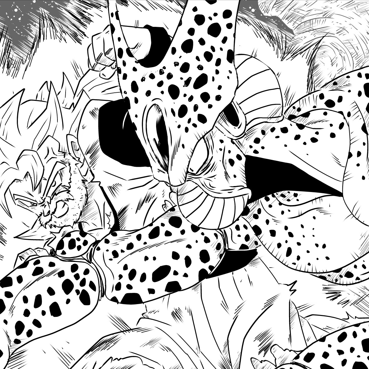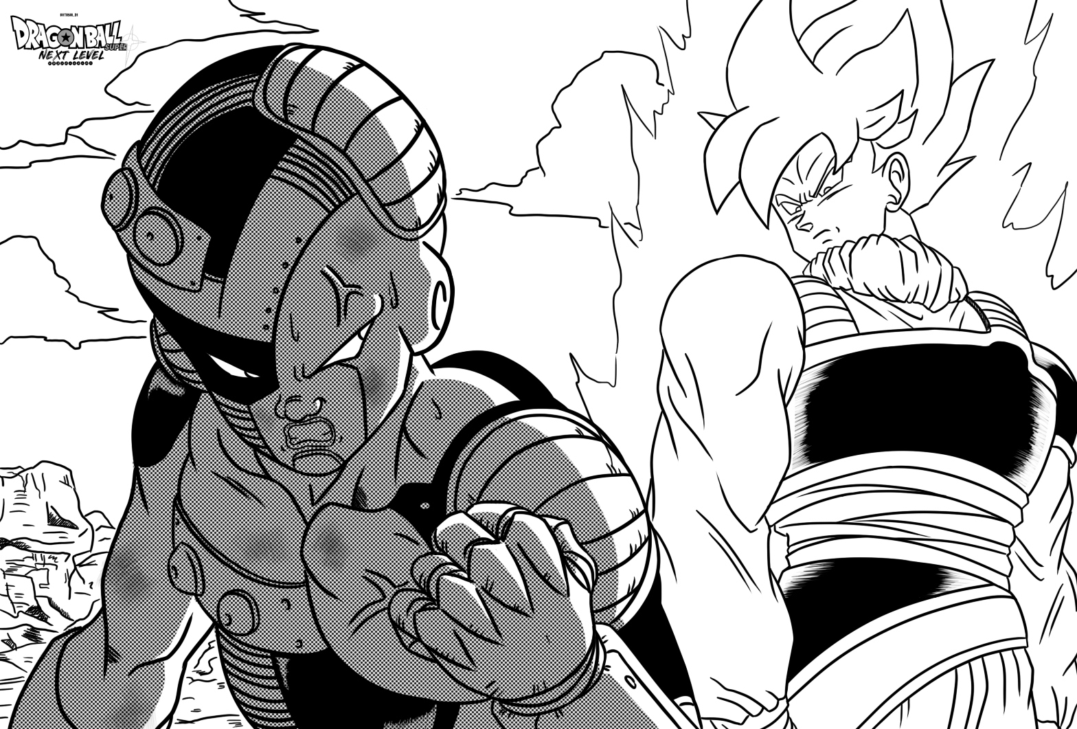 – “Kakarotto…” – piensa Vegeta. – “¿Cómo ha llegado tan rápido? ¿De dónde ha salido?”