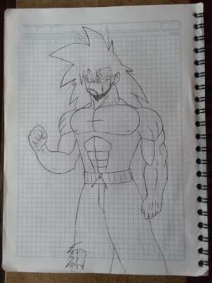 El ki del saiyajín empieza a aumentar, su cabello se eriza y su mirada cambia. Su cabello se vuelve amarillo y sus ojos verdes, mientras su energía estalla y su cuerpo se envuelve en un aura dorada y brillante.