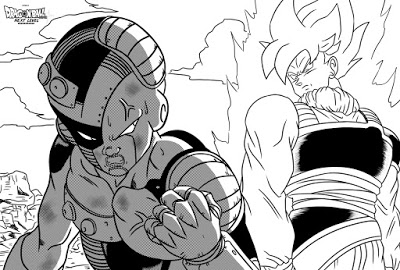Goku encaja el golpe sin intentar esquivarlo y retrocede dos pasos. Cold sonríe, viéndose vencedor. Pero la expresión del Emperador cambia radicalmente al ver que Goku se recupera al instante y se limpia la sangre del labio con el dorso de su mano.