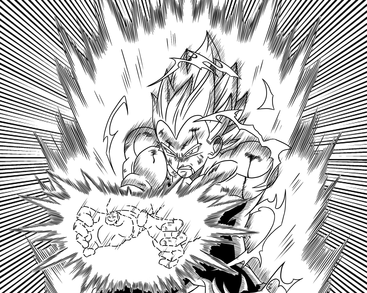 Vegeta desaparece y reaparece frente a Freezer, que retrocede lentamente. Ambos se miran sin mediar palabra durante unos segundos, y Vegeta le golpea en el abdomen, haciendo que el tirano escupa sangre.