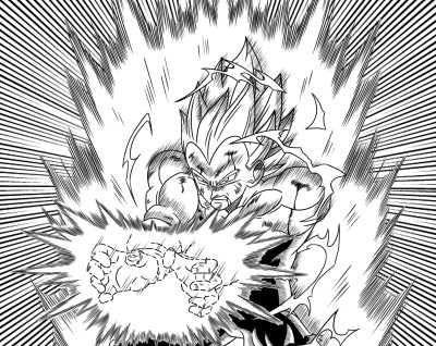 – “Y ahora atacas a mi hijo, haces daño a mi mujer e intentas matar a mi hija… No voy a perdonarte jamás, Freezer.” – continua Vegeta, apretando con fuerza los puños, mientras su ki se eleva.