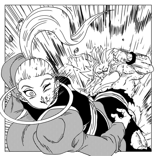 Mientras tanto, Dabra sufre una terrible tortura por parte de Majin Bu. Son Gohan observa el terrible combate mientras escucha las palabras del Dios.