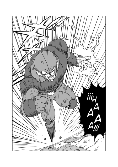 Tras el aterrador choque de energía, la polvareda empieza a disiparse y revela a Son Gohan aún en pie, con la ropa hecha trizas. Detrás de él, sus amigos, pese a haber sido arrollados por la onda expansiva de la devastadora explosión, han sobrevivido al ataque del monstruo Bu.